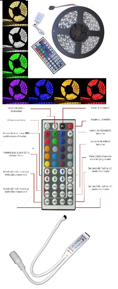 * Control RGB (16 Teclas), con el cual puedes alternar entre los colores, además entre los diversos modos como: Flash, Estrobo, Fade y Smoth o prenderlo y apagarlo con el mismo control sin tener que desconectar.